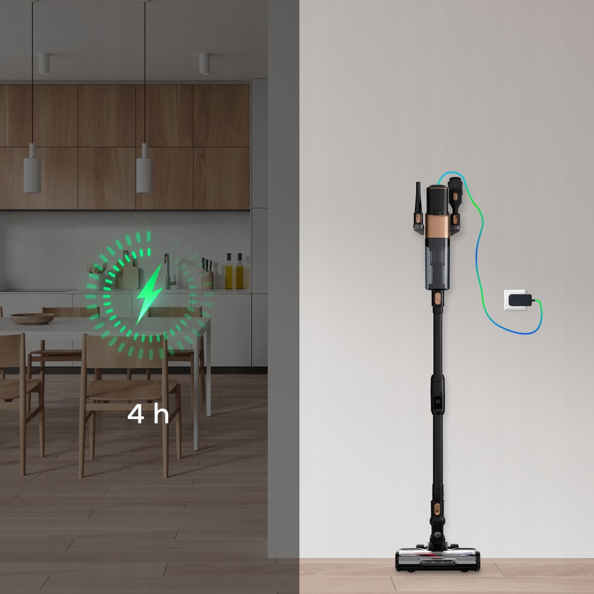 Odkurzacz został wyposażony w stację naścienną, na której możesz również ładować odkurzacz, dzięki czemu jest on zawsze pod ręką i nieprzerwanie gotowy do ponownej pracy.
