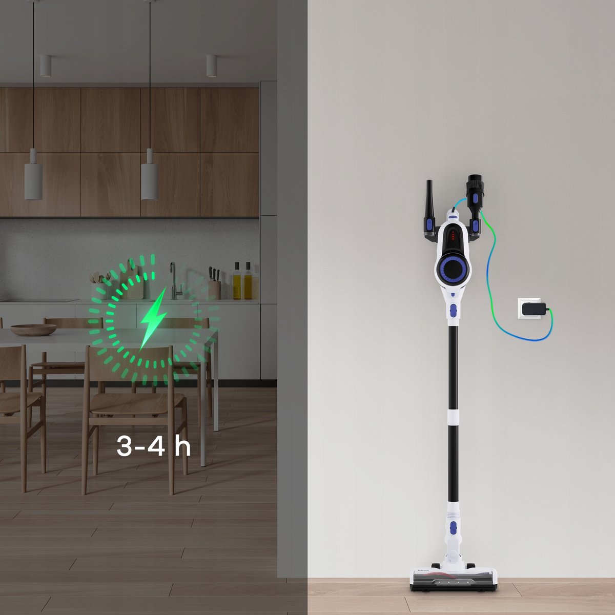 Odkurzacz został wyposażony w stację naścienną, na której możesz również ładować odkurzacz, dzięki czemu jest on zawsze pod ręką i nieprzerwanie gotowy do ponownej pracy.