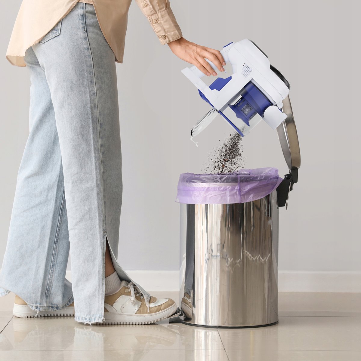 Duży pojemnik pozwala na nieprzerwane odkurzanie i nie wymusza częstego opróżniania pojemnika, które tak czy inaczej jest banalnie proste. Wystarczy wcisnąć jeden przycisk, a klapka pojemnika na kurz sama się otworzy, śmieci wypadną same, przez co Ty nie masz z nimi jakiegokolwiek kontaktu.