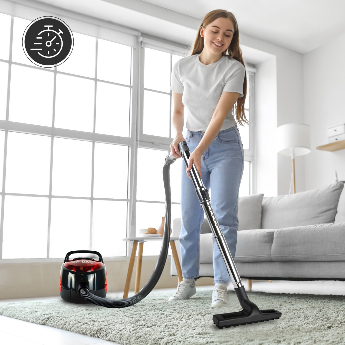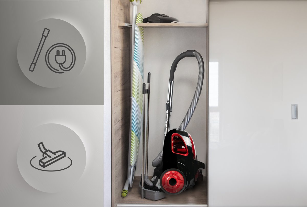Dzięki długiemu przewodowi oraz teleskopowej rurze odkurzacz ma duży zasięg pracy co pozwala na odkurzanie dużej powierzchni.