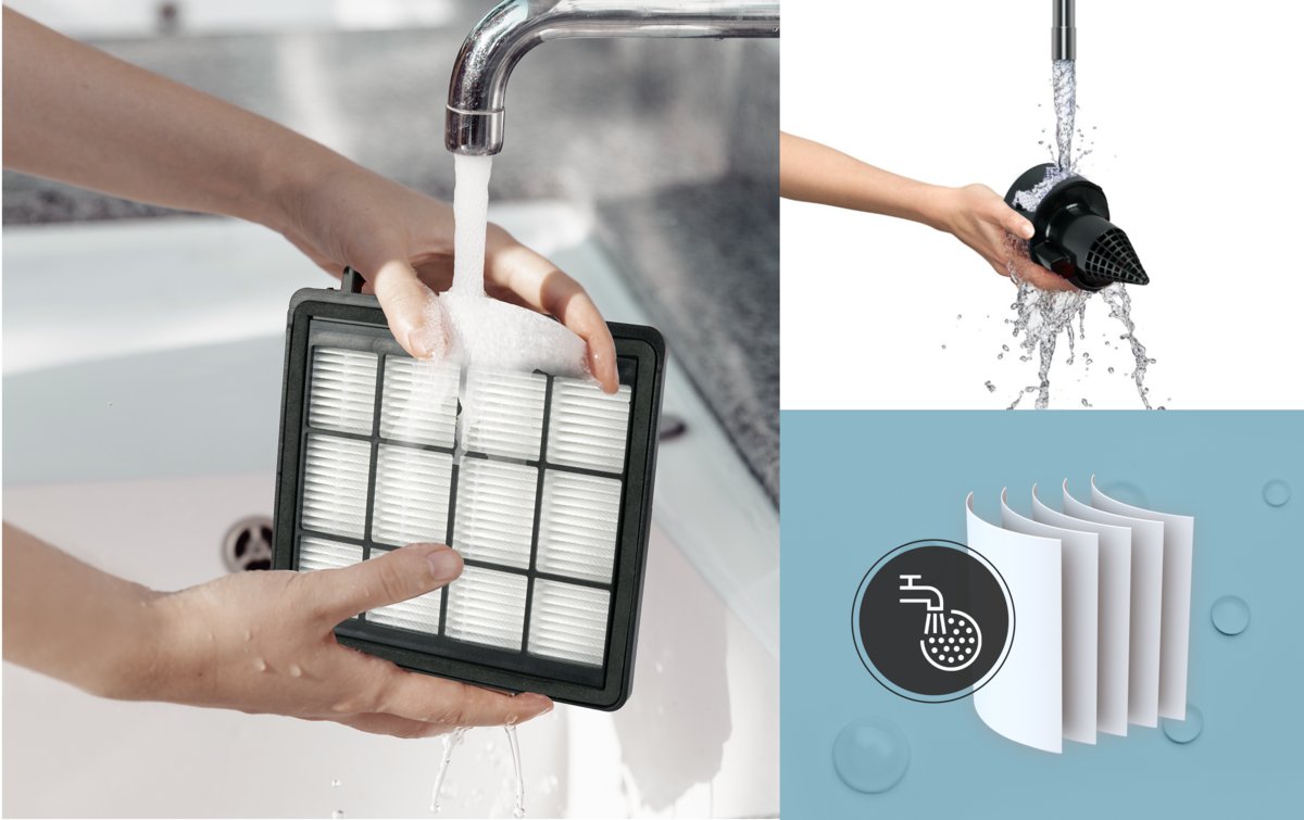 W odkurzaczu wykorzystano 3-stopniowy system filtracji, który skutecznie zatrzymuje wszystkie zanieczyszczenia. Dzięki temu mamy pewność, że wszelkie bakterie wraz z kurzem pozostaną w opróżnianym pojemniku i nie wydostaną się z powrotem na zewnątrz.