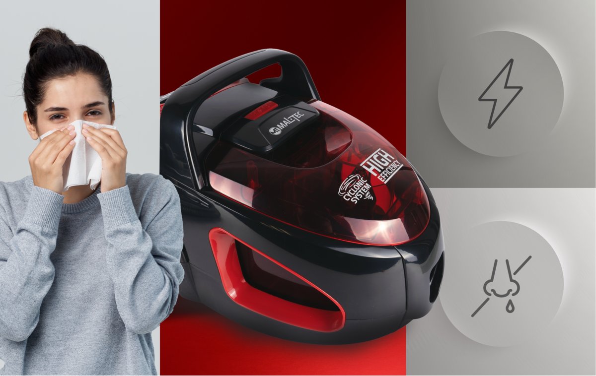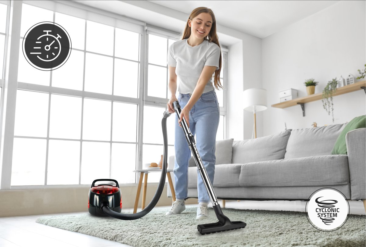 W odkurzaczu wytwarzają się cyklony, które bardzo skutecznie oddzielają cząsteczki kurzu od przepływającego powietrza. Dzięki temu powietrze, które wydostaje się na zewnątrz jest czystsze od zasysanego. Skuteczność oczyszczania wspierają dodatkowe filtry, które zatrzymują zanieczyszczenia.
