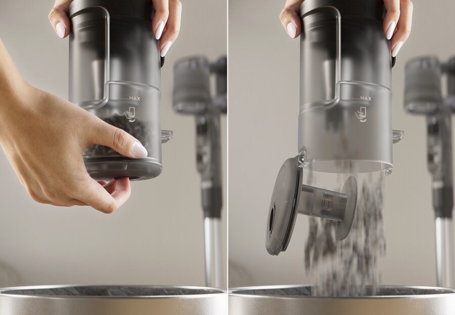 ✅Higieniczne i szybkie opróżnianie pojemnika na kurz jednym przyciskiem, bez kontaktu z zabrudzeniami.