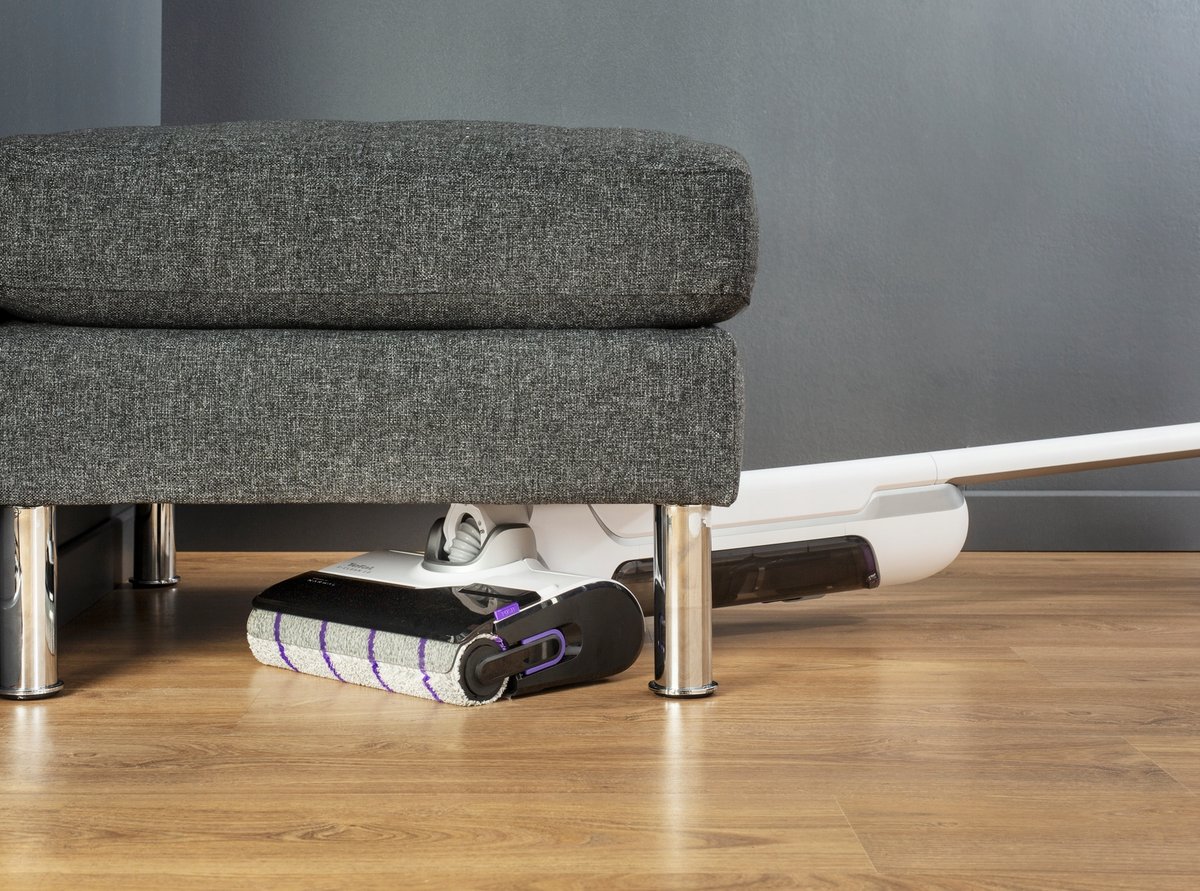 Urządzenie wyposażone jest w obrotową rolkę oraz moc ssącą 18 000 Pa, dzięki czemu odkurza i myje powierzchnie jednym ruchem — bez smug i konieczności szorowania