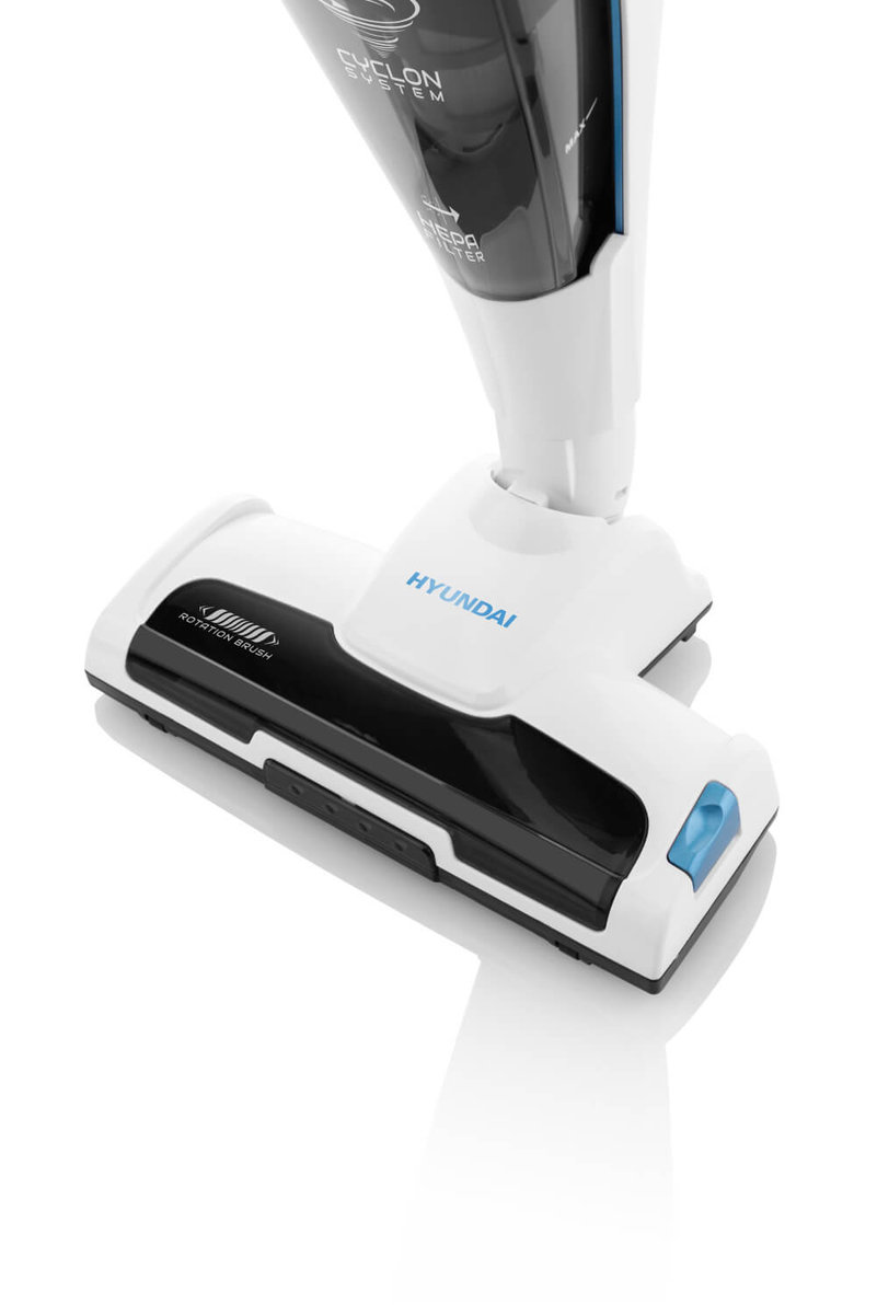 Odkurzacz pionowy wyposażony jest w szczotkę rotacyjną, która skutecznie odkurza dywany oraz podłogi, jednocześnie ułatwiającą czyszczenie trudno dostępnych miejsc. Podczas pracy nie ogranicza Cię długość przewodu zasilającego. Hyundai VC914 jest wyposażony w akumulator Li-Ion 14,4 V, zapewniający pracę przez około 25 minut. Do pełnego naładowania potrzebuje 3,5 godziny.