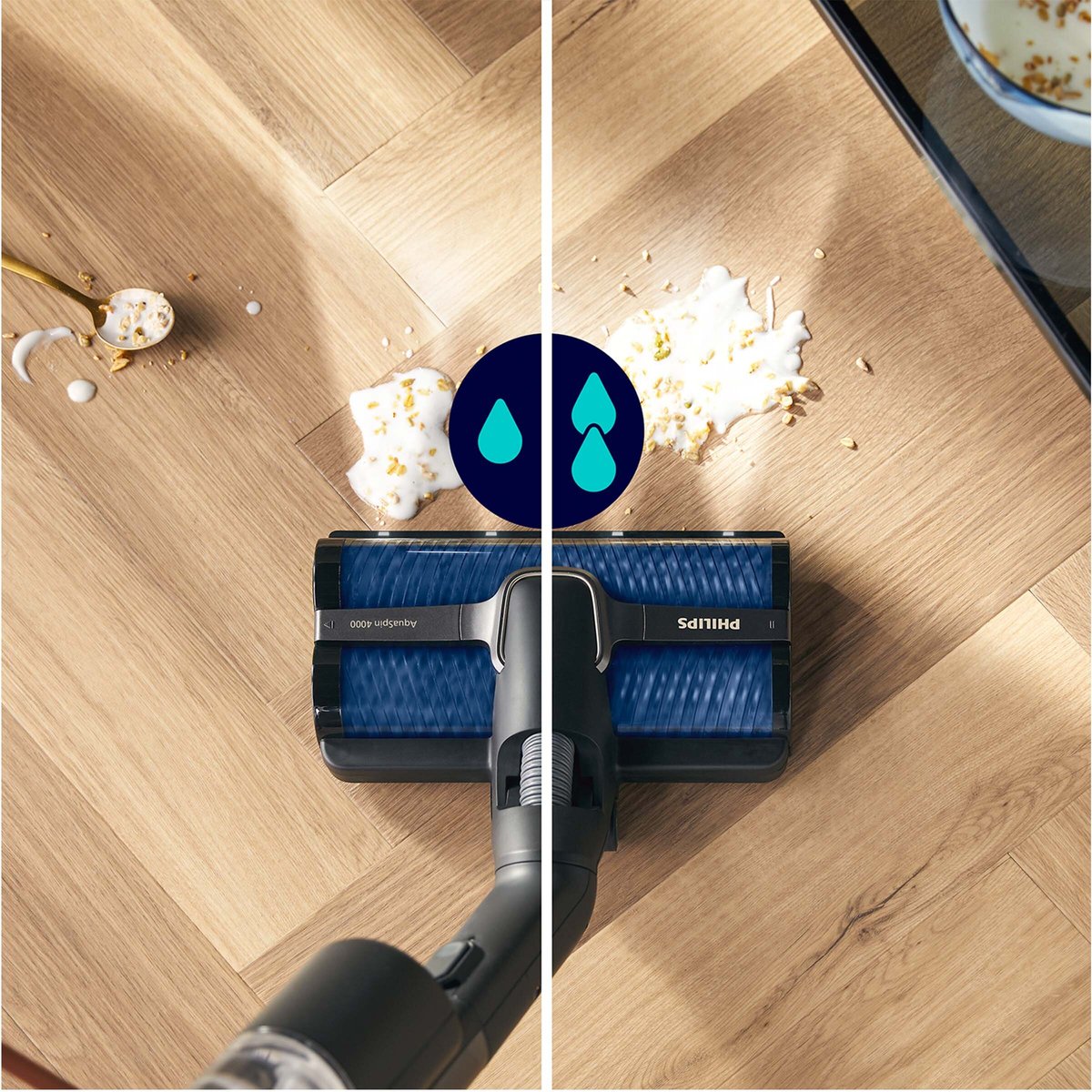 Oferuje kompleksowe czyszczenie twardych podłóg na mokro, skutecznie eliminując kurz, brud, plamy, rozlane płyny oraz bakterie w jednym ruchu. Wyposażony w dwie ultramiękkie szczotki PowerBrush z mikrofibry, które obracają się w przeciwnych kierunkach z prędkością do 4000 obrotów na minutę, odkurzacz zasysa zanieczyszczenia bezpośrednio do urządzenia, zamiast je osadzać na szczotkach. Całość, w tym szczotki, można łatwo wyczyścić na stacji dokującej za pomocą automatycznego programu, który trwa jedynie 4 minuty.