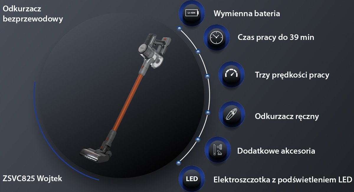 Nasz odkurzacz pionowy ZSVC825 Wojtek z wymiennym akumulatorem 25,9 V to idealne rozwiązanie dla każdego, kto ceni sobie wygodę i mobilność. Dzięki trzem ustawieniom prędkości oraz elektroszczotce z podświetleniem LED każde sprzątanie staje się szybkie i skuteczne. Długi czas pracy wynoszący 39 minut oraz krótki ładowania (tylko 180 minut) zapewniają wygodę użytkowania. Dodatkowo, odkurzacz został wyposażony w dodatkowe akcesoria: uchwyt naścienny, ssawkę 2 w 1, ssawkę szczelinową i 2 rolki do elektroszczotki do każdej powierzchni podłogi, co czyni go uniwersalnym narzędziem do sprzątania każdego kąta w Twoim mieszkaniu.