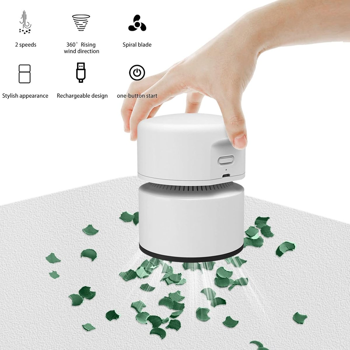 【Aplikacja】 Wymiary produktu: 80 x 80 x 105 mm. Nasz bezprzewodowy odkurzacz ręczny pozwoli Ci pozbyć się skrawków papieru, kurzu, sadzy, psiej sierści i innych drobnych przedmiotów ze stołów, klawiatur laptopów, biurek, powierzchni mebli, poduszek, samochodów itp.