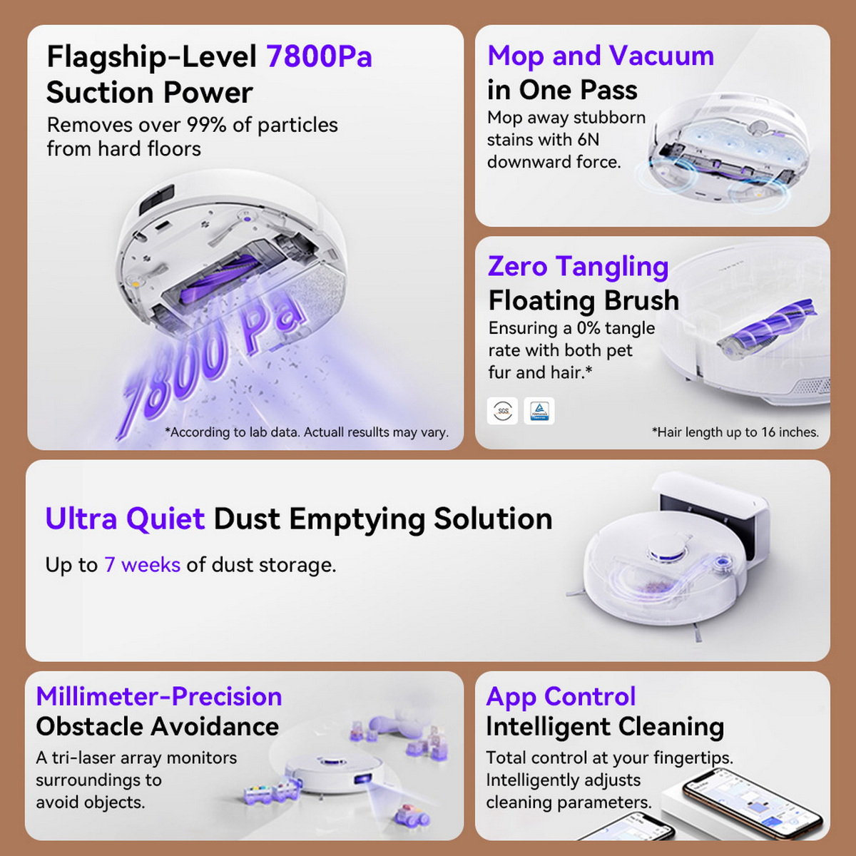 Dzięki niesamowitej mocy ssania 7800 Pa Narwal Freo X Plus z łatwością usuwa 99% kurzu z twardych podłóg, dywanów i chodników, utrzymując brud z dala od podłóg i zapewniając czyste i komfortowe środowisko życia. W przeciwieństwie do dużej mocy ssania, działa przy bardzo niskiej głośności, co nie wpłynie na codzienne życie i pracę.
