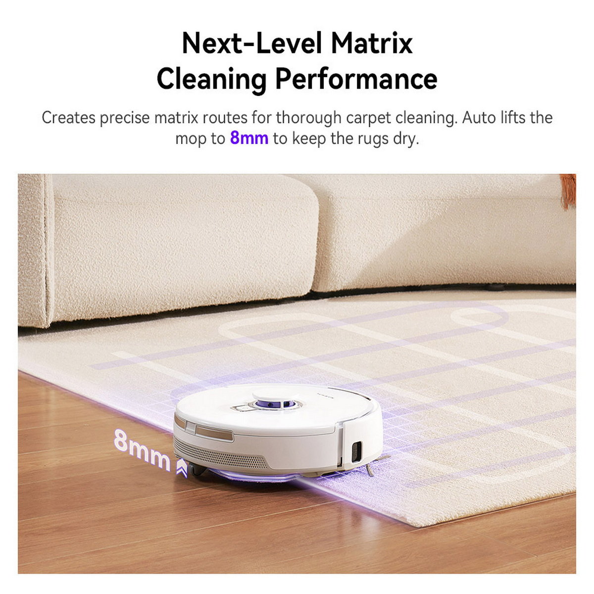 Narwal Freo X Plus skanuje otoczenie we wszystkich kierunkach, aby utworzyć ekskluzywną mapę 3D pomieszczenia, pomagając Narwal Freo X Plus wyznaczyć idealną trasę czyszczenia. Nie jest ograniczony przez warunki oświetlenia otoczenia i dobrze działa w każdych warunkach oświetleniowych. Podwójne czujniki boczne i przednie łatwo wykrywają i omijają mniejsze przeszkody, unikając małych i nisko położonych obiektów (ten laser jest przyjazny dla zwierząt domowych). Narwal Freo X Plus jest również wyposażony w funkcję podnoszenia mopa o 8 mm, która nie zamoczy dywanu, idealnie dostosowaną do podłóg i dywanów.