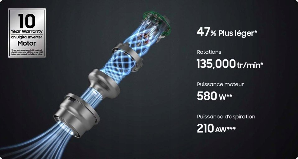 Czyść znacznie wydajniej i bez wysiłku dzięki niesamowitej mocy ssania. Silnik Digital Inverter wyposażony jest w ulepszony stojan, wirnik i wentylator 3D. Jest o 47% lżejszy* i obraca się z prędkością do 135 000 obr./min, zapewniając dużą moc wejściową do 580 W**, wysoką efektywność energetyczną i siłę ssania do 210 AW***.