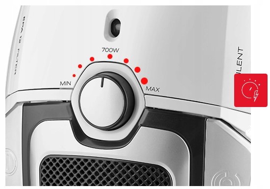 Zbyt małe ssanie lub zbyt duży pobór mocy wobec Twoich potrzeb? Łatwo dostosuj moc ssania odkurzacza do rodzaju czyszczonej powierzchni! Prosta regulacja za pomocą suwaka lub pokrętła umieszczonego na odkurzaczu pozwoli Ci nie tylko sprawniej i skuteczniej odkurzać różnego rodzaju przestrzenie, ale też oszczędzić na rachunkach za energię!