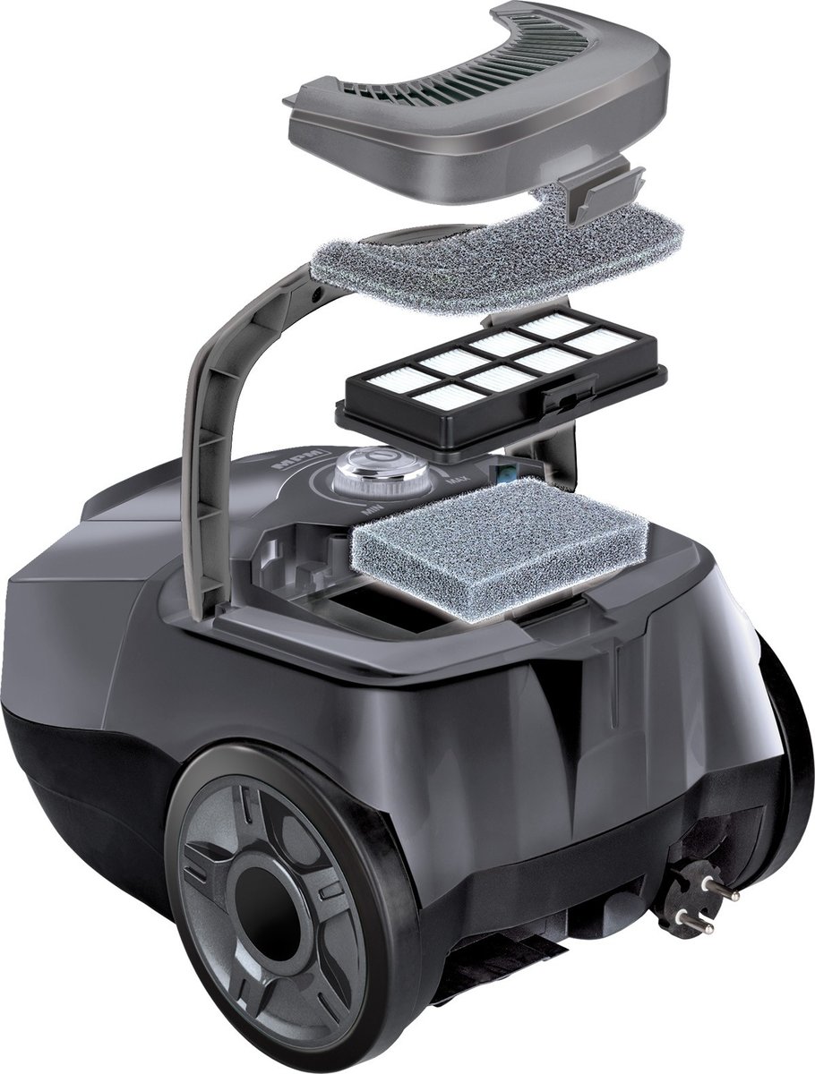 Wielopoziomowy system filtracji tego odkurzacza pozwala skutecznie eliminować zanieczyszczenia, bakterie i wirusy. Filtr typu HEPA oraz dwa filtry gąbkowe, filtr piankowy i worek tekstylny na kurz, tworzą wspólnie 5-stopniowy system filtrowania.