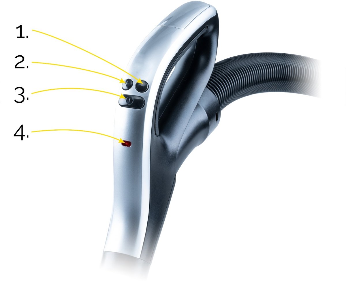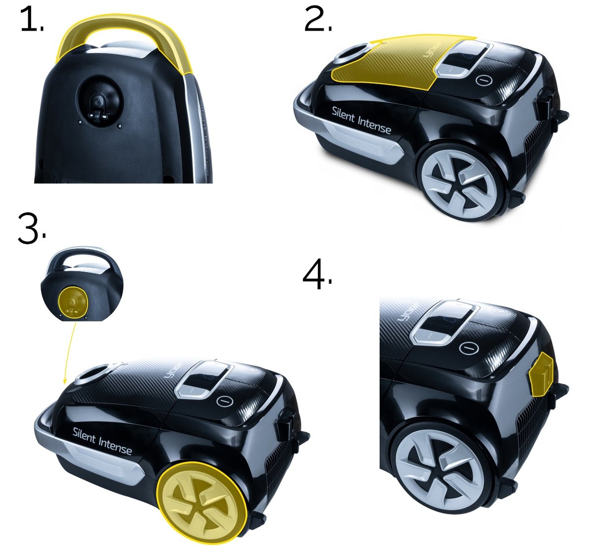 1️⃣ Uchwyt do przenoszenia - ułatwia przenoszenie odkurzacza z pokoju do pokoju lub pomiędzy piętrami