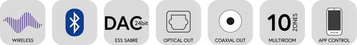 - Wyjścia cyfrowe (optyczne i koaksjalne): WiFi/Lan - 24bit/192kHz / Bluetooth - 16bit/44.1kHz