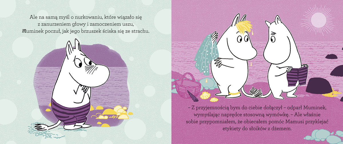 Jest piękne letnie popołudnie i Muminek chętnie poszedłby nurkować z Panną Migotką. Ale na samą myśl o zamoczeniu uszu ze strachu ściska mu się brzuszek. Chciałby być choć trochę bardziej odważny! ...