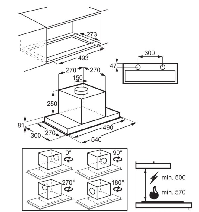 Okap do zabudowy o szerokości 54 cm, pracujący z wydajnością 300 - 580 m3/h, w trybie intensywnym osiąga wydajność 700 m3/h. Elektroniczne sterowanie, klasa energetyczna A, roczne zużycie energii na poziomie 54.7 kWh/rok. Oświetlenie 2 x LED. Ilość prędkości: 3 + tryb intensywny. Poziom hałasu: 54 - 67 dB.