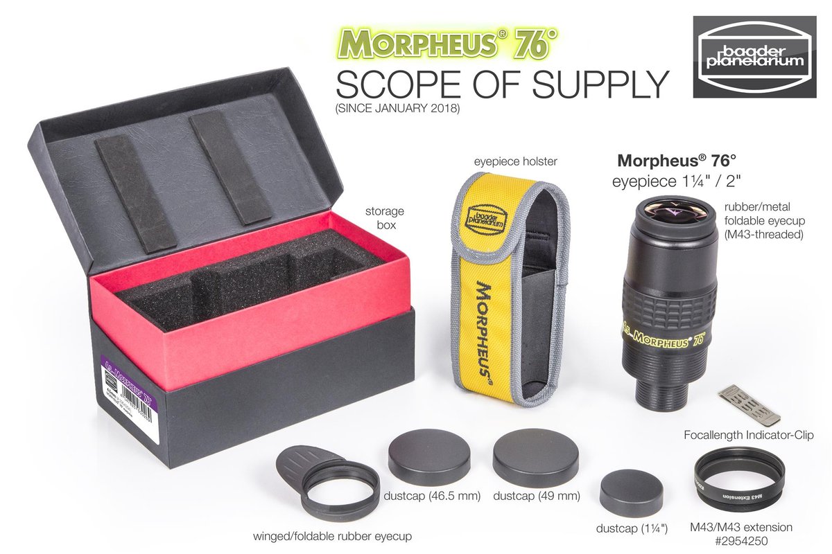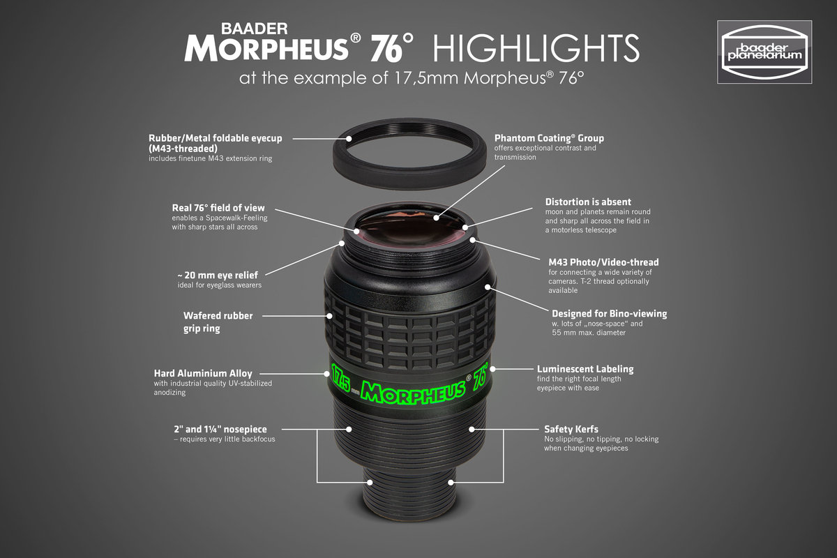Okulary Baader Morpheus są nie tylko doskonałe optycznie. Dopracowana jest również ich obudowy, które są wodoodporne i zoptymalizowane pod kątem lekkości i użyteczności w nasadkach bino. Okulary całej serii są parfokalne. Wyposażono je w gwint M43, który pozwala na podłączenie wielu adapterów służących astrofotografii parfokalnej i okularowej. Najwyższa jakość obrazu i duży odstęp źrenicy wyjściowej połączona z mnogością adapterów w ofercie Baadera powoduje, że okulary Morpheus nie mają sobie równych pod tym względem.