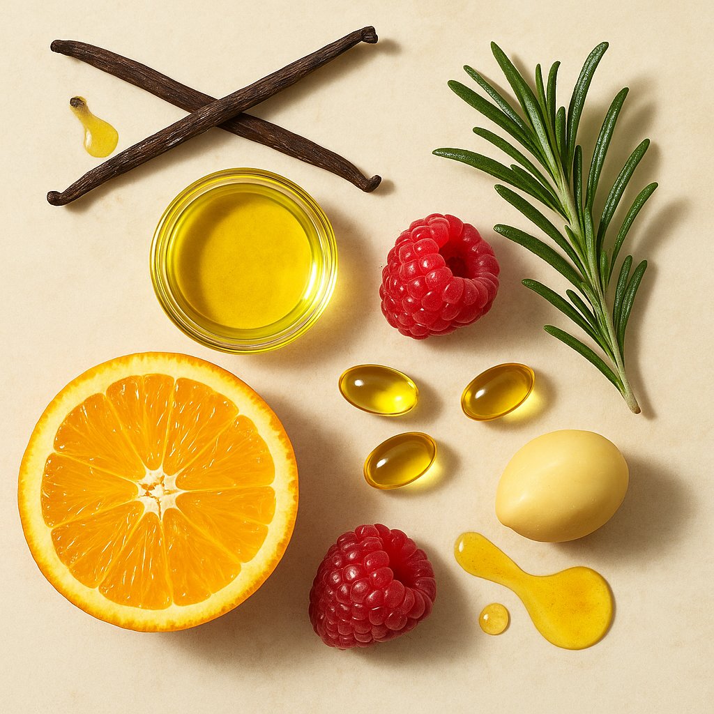 Palmitynian retinylu (witamina A) – najłagodniejsza forma retinolu. Stymuluje odnowę komórkową i produkcję kolagenu.Koenzym Q10 + witamina E – silne antyoksydanty. Rozjaśniają cerę, poprawiają koloryt i regenerują mikrouszkodzenia.Olej z pestek malin – działa przeciwzapalnie, przyspiesza gojenie.Olej waniliowy – wygładza, zmiękcza i nadaje skórze blasku.Olej sezamowy – głęboko nawilża i koi podrażnienia.Olej makadamia – regeneruje, wygładza i ujędrnia.Olejek z bergamotki – reguluje wydzielanie sebum.Olejek rozmarynowy – działa antyoksydacyjnie i antyseptycznie.