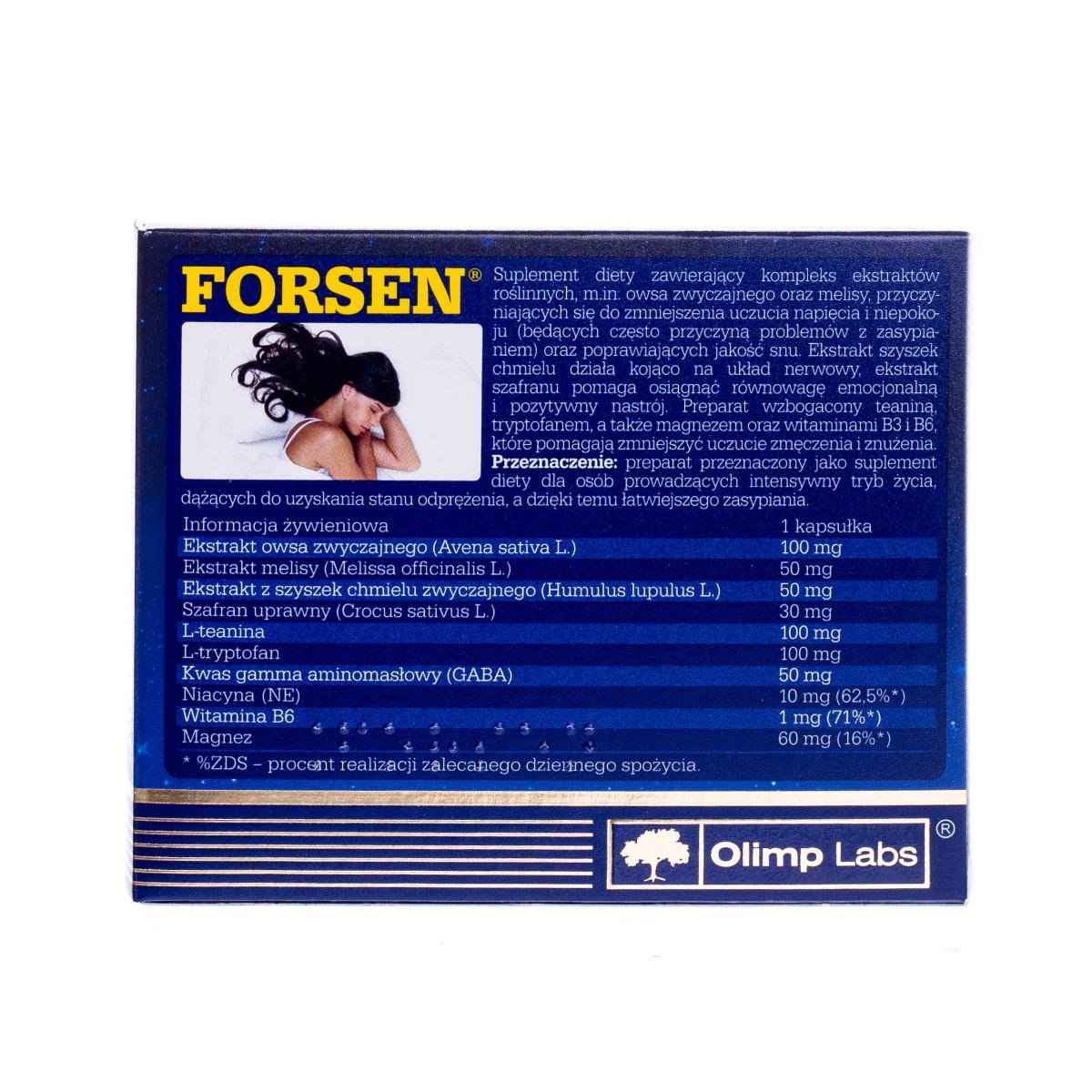 Forsen® to suplement diety zawierający kompleks ekstraktów roślinnych, takich jak: ekstrakt owsa zwyczajnego oraz melisy przyczyniających się do zmniejszenia uczucia napięcia i niepokoju (będących często przyczyną problemów z zasypianiem) oraz poprawiających jakość snu, niezbędnego do regeneracji i prawidłowego funkcjonowania organizmu. Ekstrakt szyszek chmielu działa kojąco na układ nerwowy, ekstrakt szafranu pomaga osiągnąć równowagę emocjonalną i pozytywny nastrój. Preparat wzbogacono L-teaniną, L-tryptofanem, a także magnezem oraz witaminami B3 i B6, które pomagają w prawidłowym funkcjonowaniu układu nerwowego oraz przyczyniają się do zmniejszenia uczucia zmęczenia i znużenia organizmu.