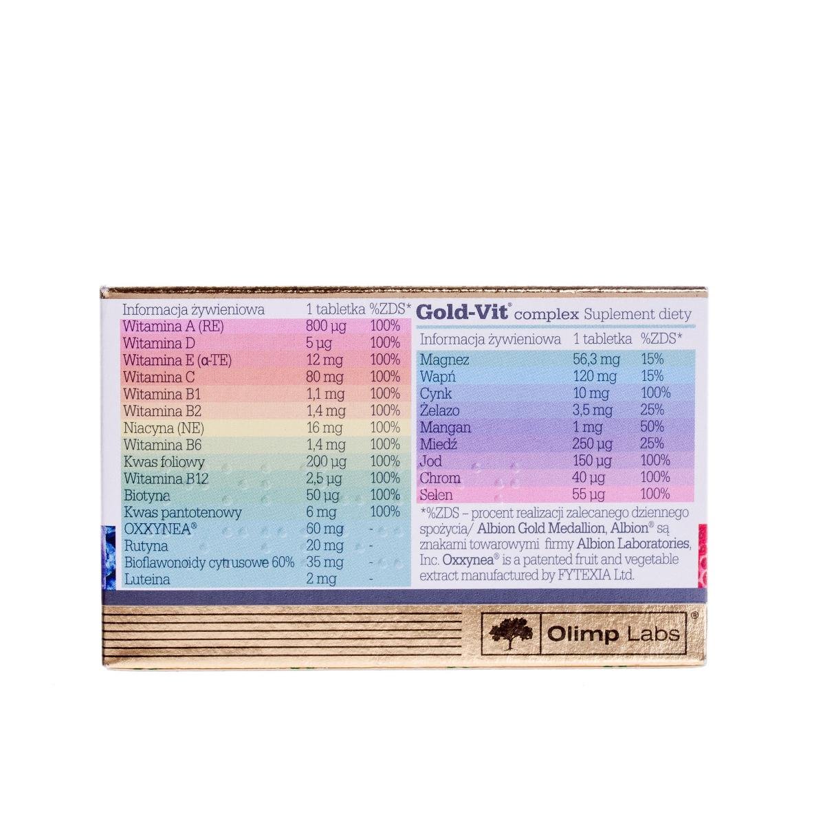 Gold-Vit® complex to kompozycja witamin i minerałów, w tym głównie w postaci wysoko przyswajalnych chelatów aminokwasowych Albion™, ułatwiająca pokrycie podstawowego zapotrzebowania organizmu na niezbędne mikroskładniki odżywcze. Suplement diety został wzbogacony luteiną, rutyną, bioflawonoidami cytrusowymi oraz ekstraktem ashwagandhy.