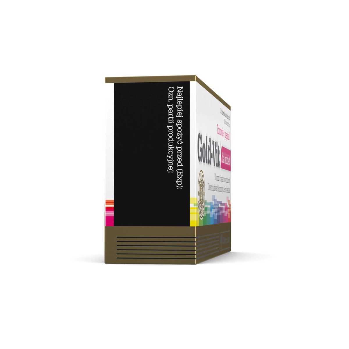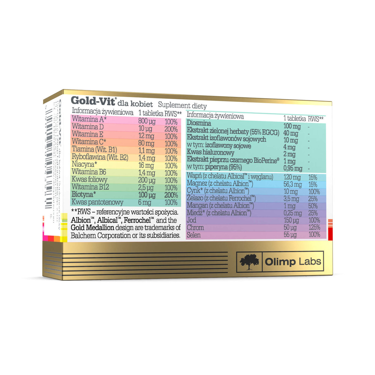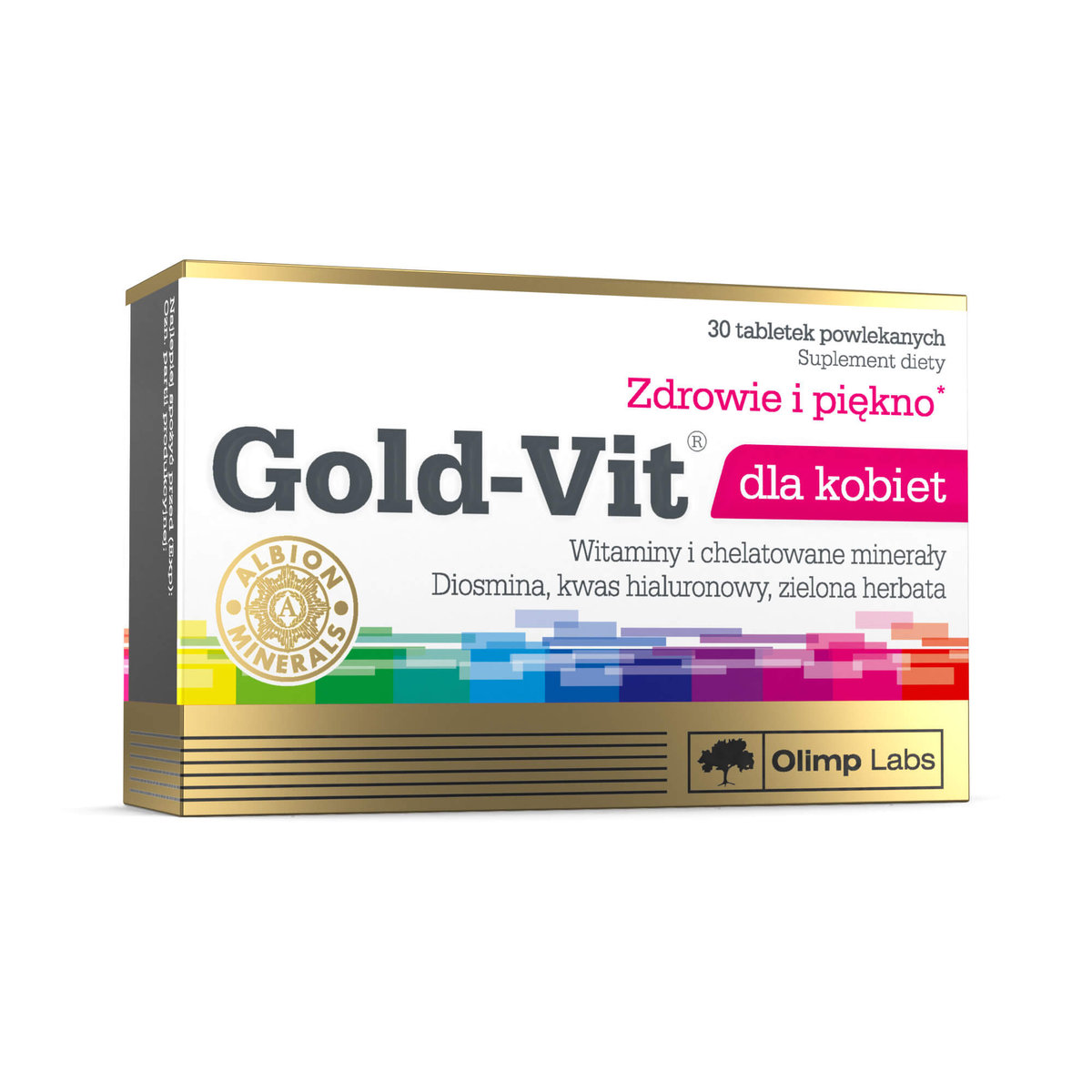 Gold-Vit® dla kobiet to kompozycja witamin i składników mineralnych, głównie w formie wysoko przyswajalnych chelatów aminokwasowych Albion™, ułatwiająca pokrycie podstawowego zapotrzebowania organizmu kobiet na niezbędne mikroskładniki odżywcze. Formuła uzupełniona została o izoflawony sojowe, ekstrakt zielonej herbaty, kwas hialuronowy oraz diosminę, a także ekstrakt pieprzu czarnego Bioperine®.