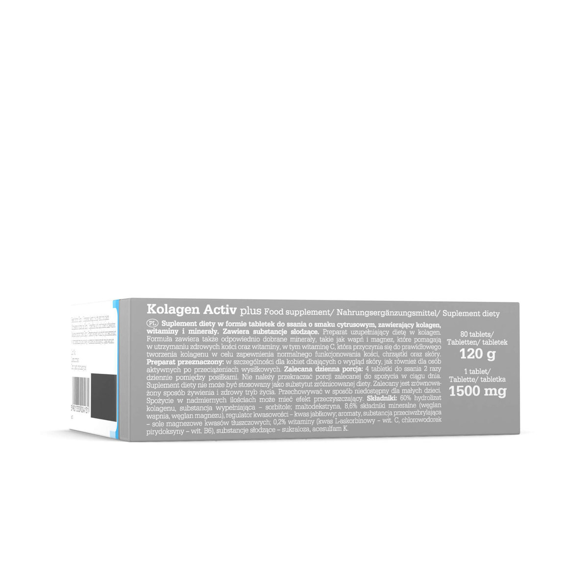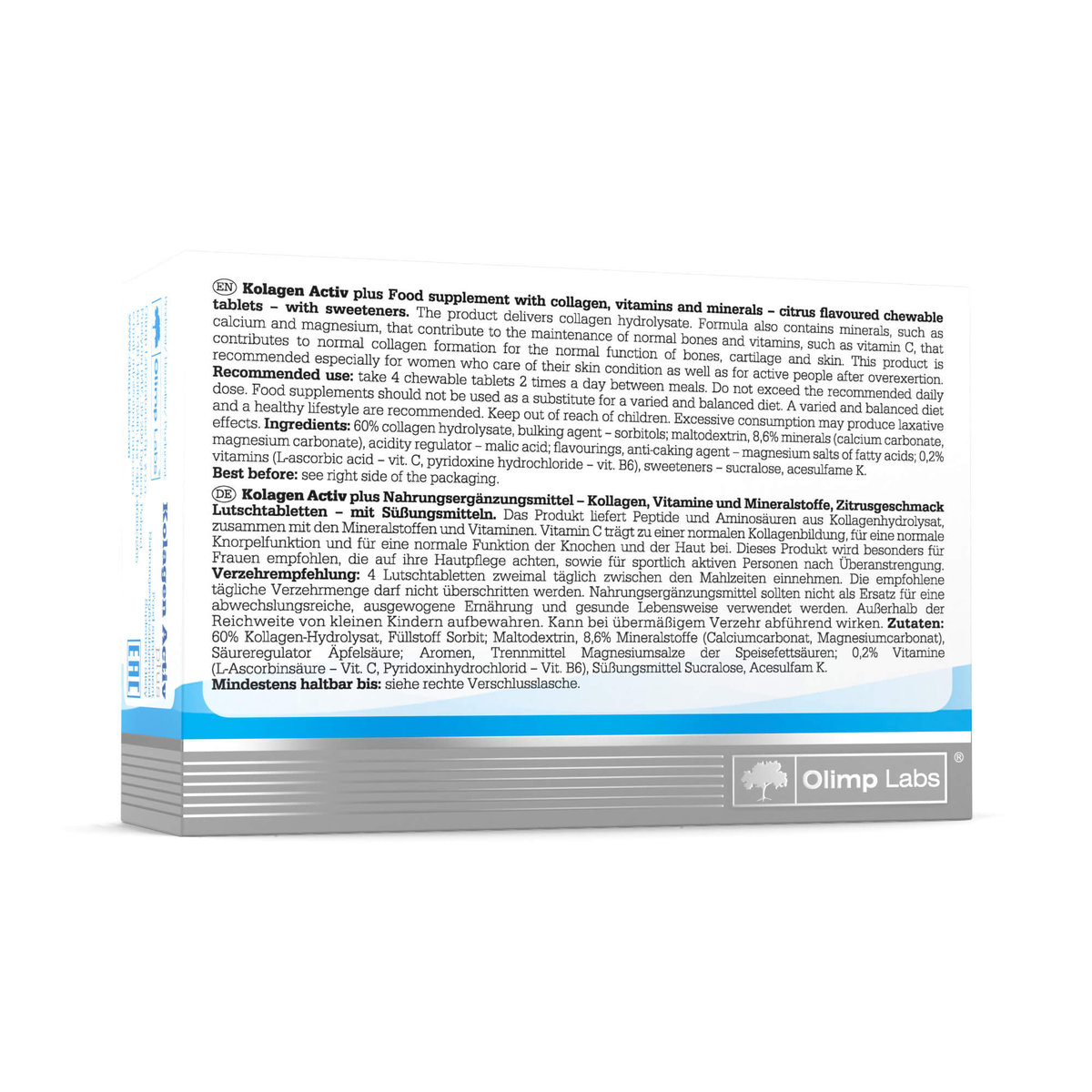 Składniki: hydrolizat kolagenu; substancja wypełniająca - sorbitol; maltodekstryna, regulator kwasowości - kwas jabłkowy; węglan wapnia, węglan magnezu, substancja przeciwzbrylająca - sole magnezowe kwasów tłuszczowych; aromaty; substancje słodzące - acesulfam K, sukraloza; witaminy (kwas L-askorbinowy – wit.C, chlorowodorek pirydoksyny – wit. B6).