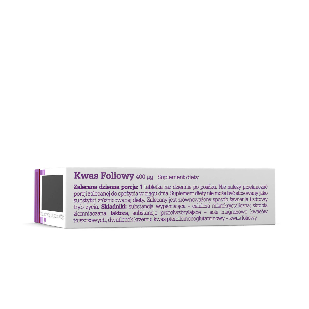 Kwas foliowy 400 µg to suplement diety w formie tabletek zawierający kwas foliowy w dawce odpowiadającej zaleceniom Zespołu Ekspertów Ministerstwa Zdrowia i Opieki Społecznej w sprawie zapobiegania wadom wrodzonym cewy nerwowej u potomstwa. Foliany przyczyniają się do wzrostu tkanek matczynych w czasie ciąży (w tym jej wczesnego etapu), biorą udział w procesie podziału komórek, pomagają w prawidłowej produkcji krwi oraz utrzymaniu prawidłowego metabolizmu homocysteiny.