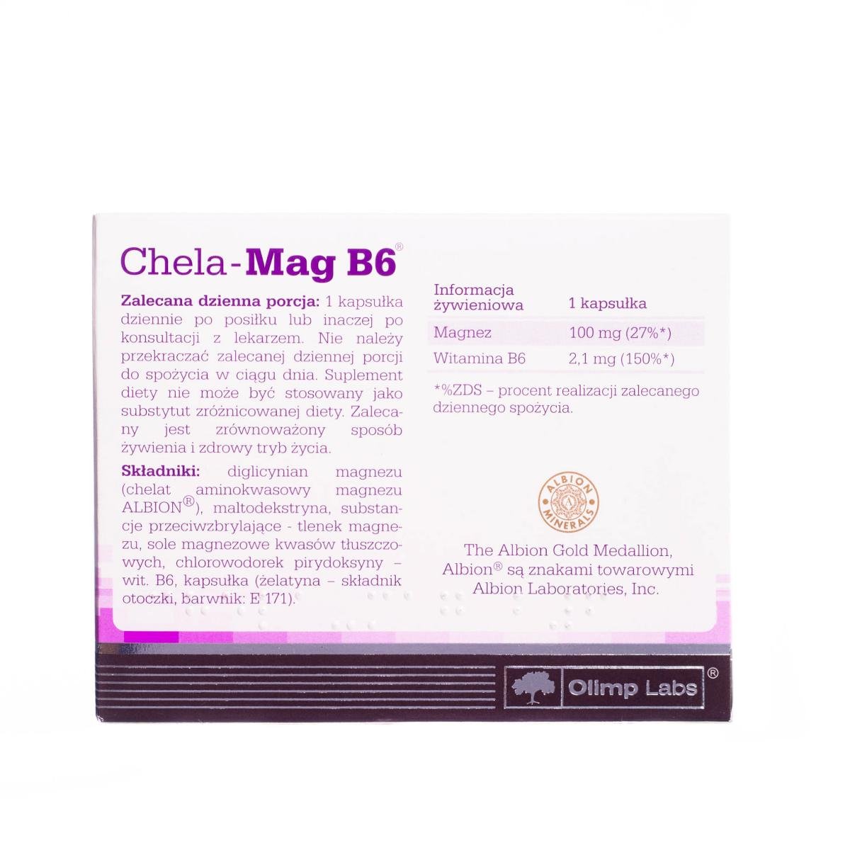 Olimp Chela-Mag B6 - suplement diety zawierający w swoim składzie hipoalergiczny chelat aminokwasowy ALBION ora wzbogacony witaminą B6. Opakowanie zawiera 30 sztuk.