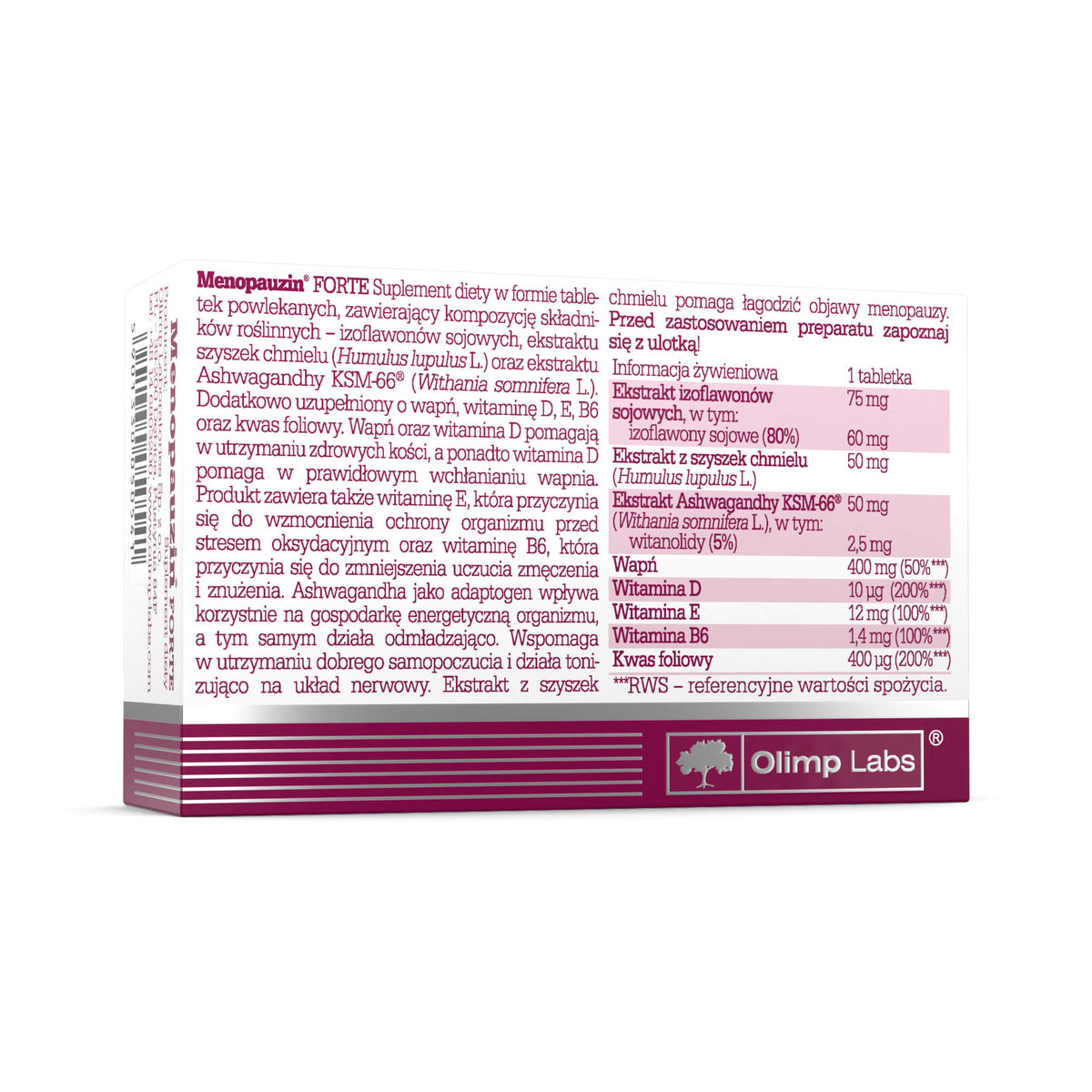 Menopauzin® Forte to suplement diety marki Olimp Labs w postaci tabletek powlekanych, zawierający kompozycję składników roślinnych – izoflawonów sojowych, ekstraktu szyszek chmielu oraz ekstraktu Ashwagandhy KSM-66® (Withania somnifera L.). Dodatkowo uzupełniony o wapń, witaminę D, E, B6 oraz kwas foliowy.