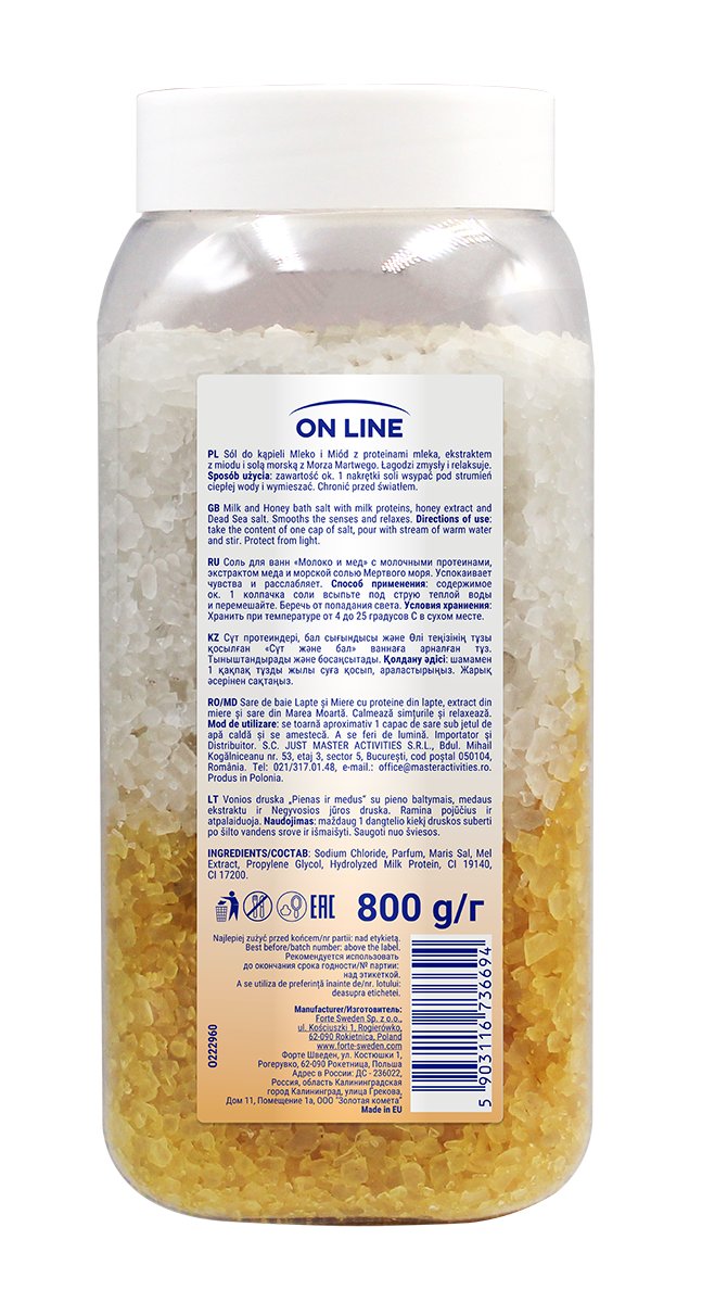 | Nazwa: | On Line, odprężająca sól do kąpieli Mleko i Miód, 800 g |