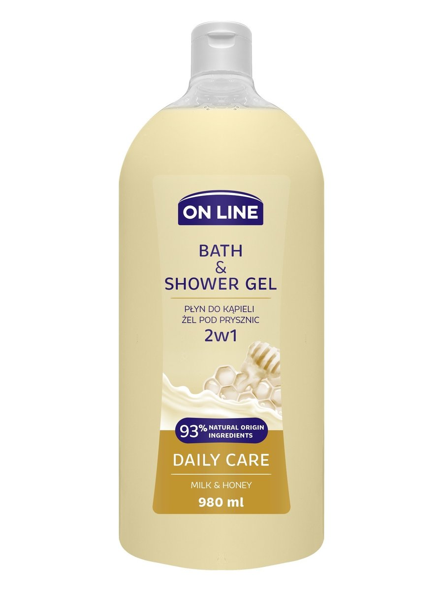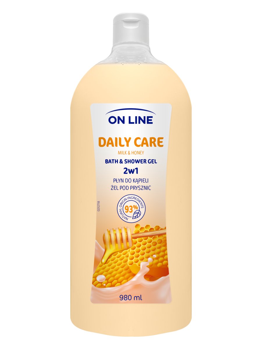ON LINE Daily Care to kremowy żel 2w1 pod prysznic i do kąpieli. Zawiera aż 93% składników pochodzenia naturalnego. Wzbogacony ekstraktem z miodu i proteinami mleka. Pozostawia skórę czystą i świeżą. Produkt posiada pH neutralne dla skóry. Może być używany również przez dzieci powyżej 3. roku życia.