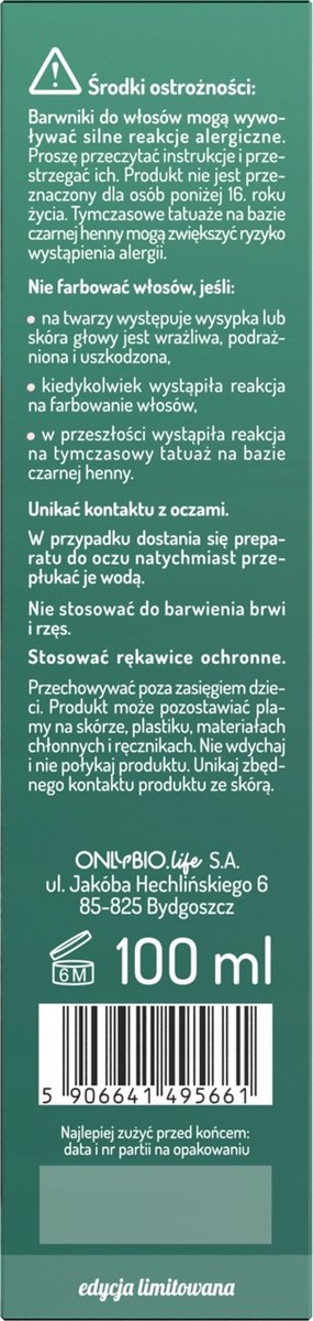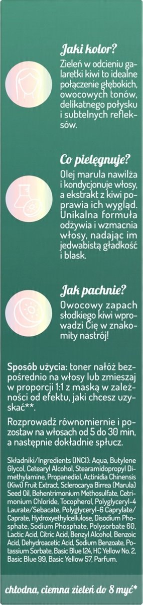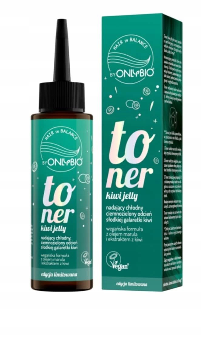 Limitowany toner do włosów brązowych OnlyBio z linii Hair in Balance, który odświeża kolor, nadając włosom chłodny, ciemnozielony odcień słodkiej galaretki kiwi.