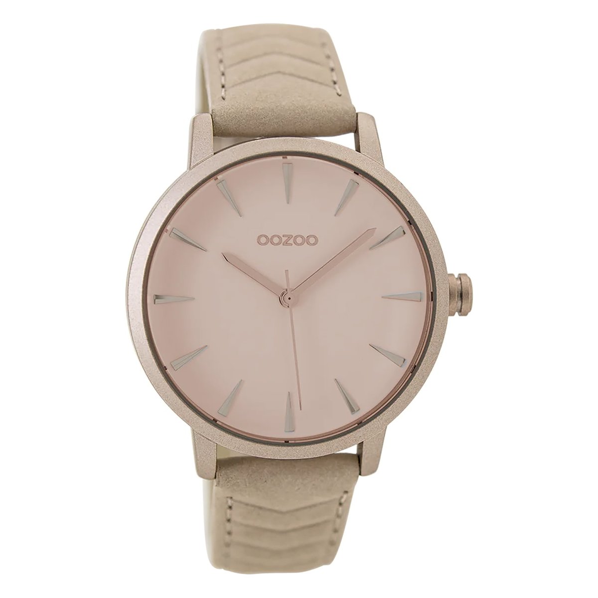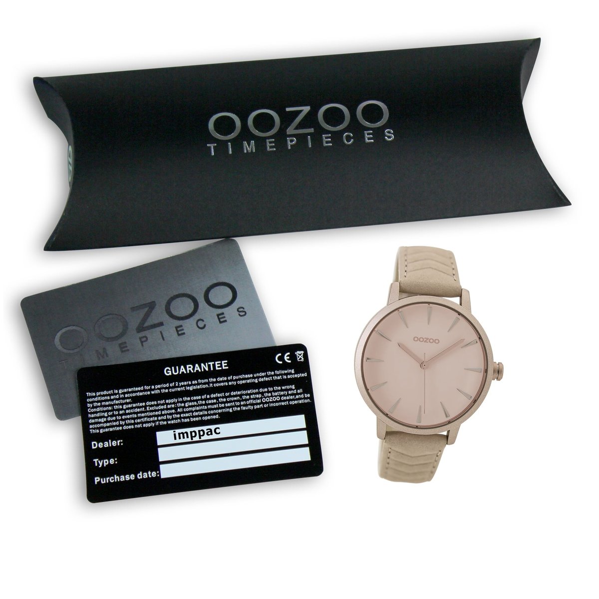 Ten casualowy zegarek damski z ekskluzywnej kolekcji Oozoo Oozoo Timepieces posiada wysokiej jakości skórzany pasek w kolorze beżowym. Koperta zegarka jest duża (około 40mm). Analogowy mechanizm i szkło mineralne sprawiają, że zegarek ten jest wysokiej jakości i modnym towarzyszem.