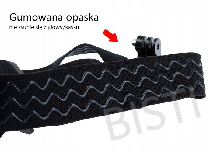 Uchwyt umożliwiający stabilne zamocowanie kamer na kasku, czapce lub bezpośrednio na głowie. Kamera mocowana jest za pomocą standardowego systemu GoPro.