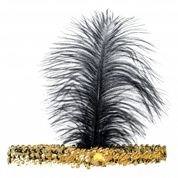 Opaska z cekinowej gumy ozdobiona strusim piórem. Szerokość - ok. 2,5 cm, długość pióra - ok. 20 cm.