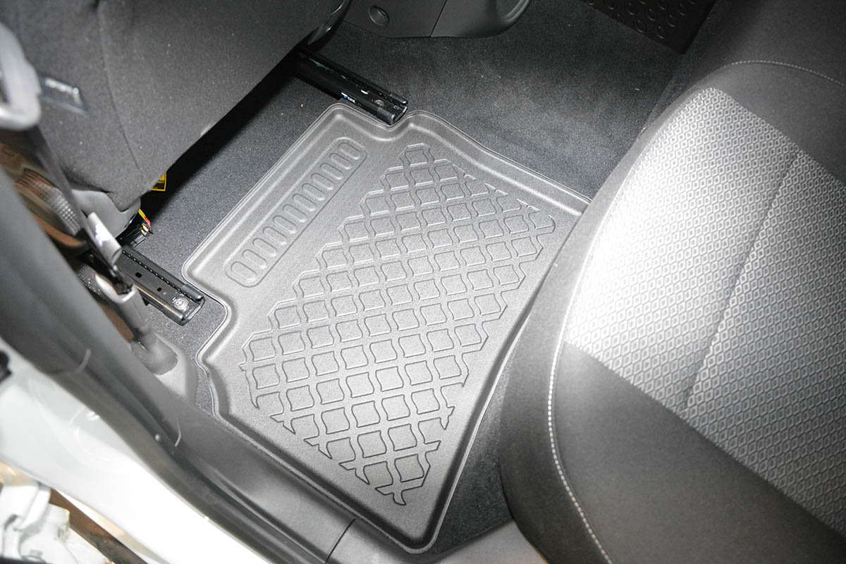 Oferowane dywaniki zostały precyzyjnie zaprojektowane do kształtu płyty podłogowej biorąc pod uwagę nie tylko markę / model samochodu, ale także rocznik oraz wersję nadwozia, dzięki czemu pasują idealnie. Dywaniki wytwarzane są z najwyższej jakości, trwałego i wzmocnionego tworzywa sztucznego, niezawierającego substancji szkodliwych dla zdrowia, co zapewnia bezpieczeństwo użytkowania. Wysoki kołnierz (brzeg) ochronny dookoła dywaników oraz stabilność kształtu skutecznie zatrzymuje wodę i brud, zabezpieczając oryginalną tapicerkę samochodową przed zabrudzeniem. Bezpieczne w użytkowaniu, dzięki praktycznemu i łatwemu w użyciu systemowi mocowania do podłogi samochodu. System mocowania dostosowany jest do marki / modelu samochodu i zabezpiecza dywanik przed przesuwaniem podczas jazdy. Matowe wykończenie oraz dopracowany wzór na powierzchni zapewniają estetyczny wygląd dywaników w samochodzie.