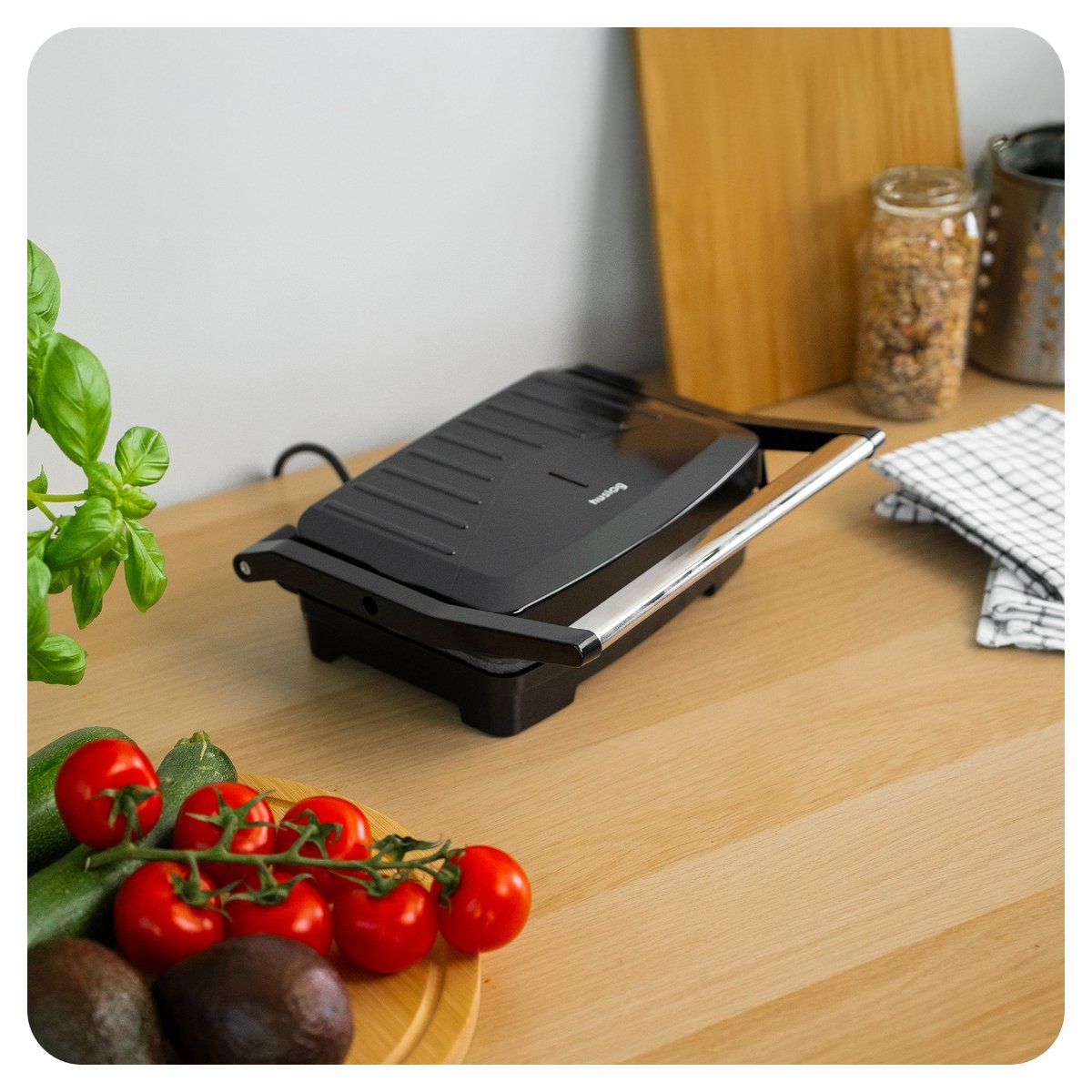 Przygotuj idealnie chrupiące, aromatyczne panini w domowym zaciszu! Opiekacz wyposażony jest w dużą płytę grzewczą typu grill (23 × 15 cm), która pomieści dwie mniejsze lub jedną dużą kanapkę. Dzięki mocy 1000 W urządzenie szybko się nagrzewa i równomiernie przypieka pieczywo, a specjalna powłoka zapobiegająca przywieraniu ułatwia czyszczenie i wyjmowanie gotowych kanapek.