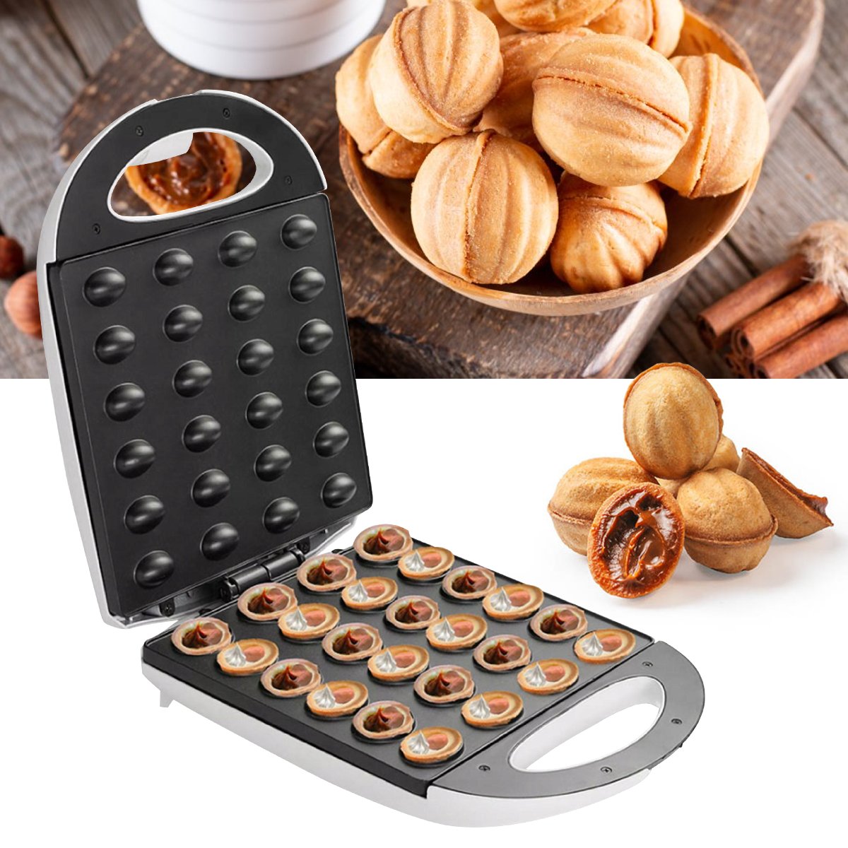 Opiekacz do orzeszkówZnany również jako opiekacz do wypieku ciasteczek w kształcie orzechów, to urządzenie do przygotowywania małych, kulistych ciasteczek z masy orzechowej.Wizualnie urządzenie