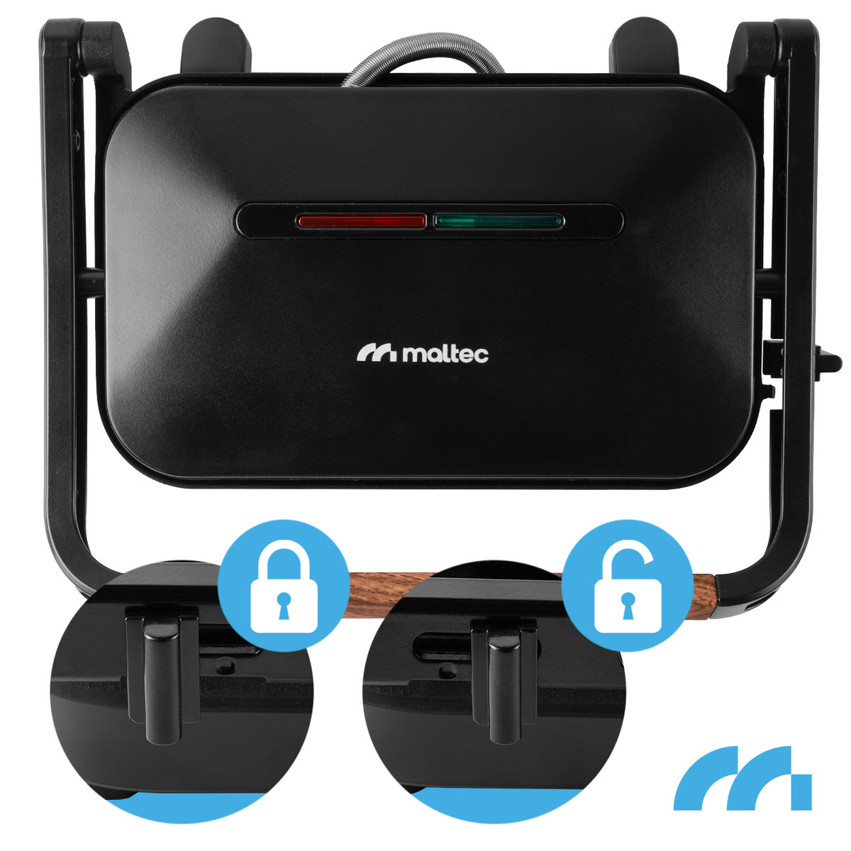 Dzięki innowacyjnemu uchwytowi, możesz bez obaw manewrować urządzeniem nawet w trakcie intensywnej pracy. Wbudowana blokada otwierania zapewnia stabilność i ochronę przed przypadkowym otwarciem oraz niedomykaniem podczas grillowania grubszych potraw, gwarantując pełen komfort użytkowania.