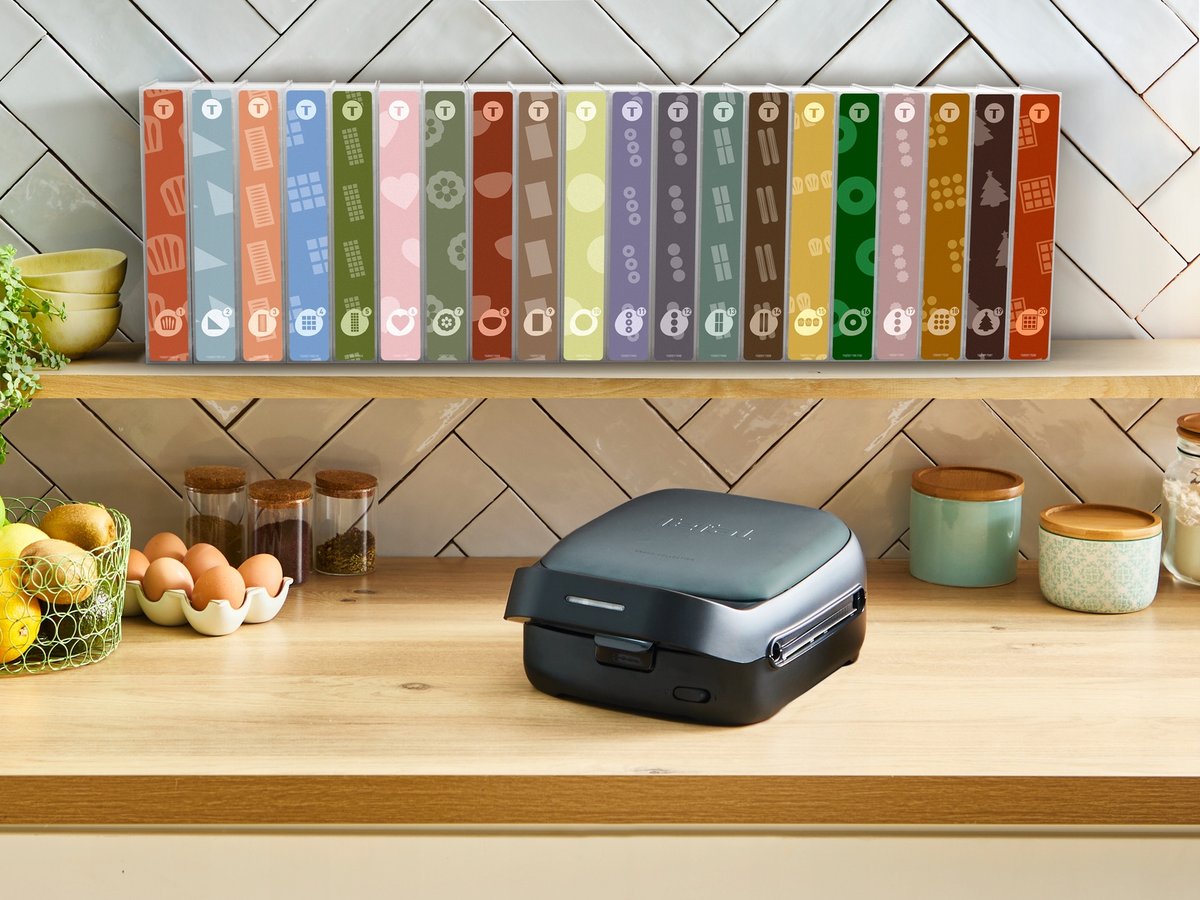Pionowa konstrukcja urządzenia i przemyślane pudełka do przechowywania kompletów wymiennych płyt pozwalają zaoszczędzić miejsce w kuchni.