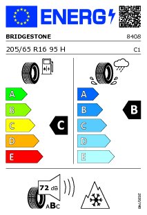 Opony zimowe BRIDGESTONE BLIZZAK LM001 w rozmiarze 205/65R16 o indeksie prędkości H (210 km/h) oraz indeksie nośności 95 (690 kg) charakteryzują się etykietą o następujących parametrach: opór toczenia C, przyczepność na mokrej nawierzchni B, poziom hałasu w dB 72.
