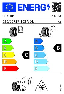 Opony zimowe DUNLOP SP WINTERSPORT 5 SUV w rozmiarze 225/60R17 o indeksie prędkości V (240 km/h) oraz indeksie nośności 103 (875 kg) charakteryzują się etykietą o następujących parametrach: opór toczenia C, przyczepność na mokrej nawierzchni B, poziom hałasu w dB 69.