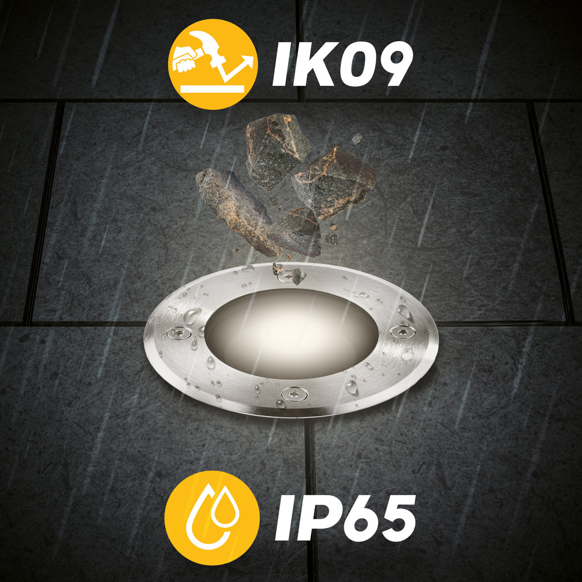 Użyte do produkcji wyselekcjonowane wysokiej jakości materiały oraz dobre spasowanie elementów sprawiają, że oprawa cechuje się wysoką odpornością na uszkodzenia mechaniczne IK09 i odpornością na ciężkie warunki atmosferyczne (IP65) - obfity deszcz, grad lub śnieg.