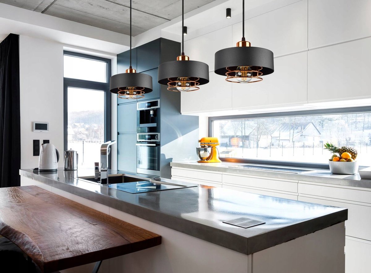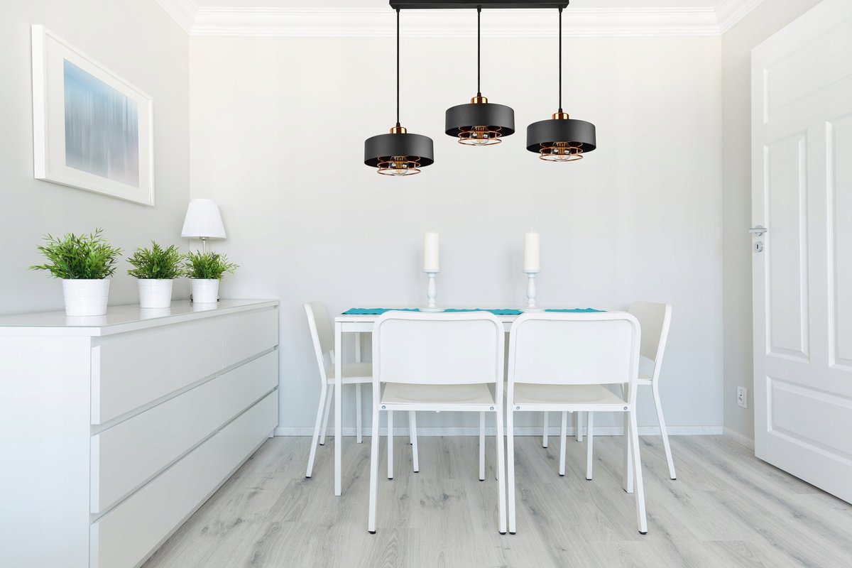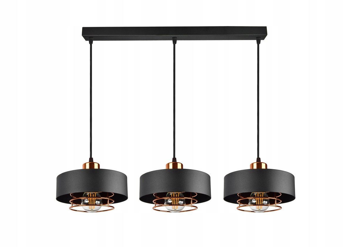 Lampa Wisząca Sufitowa w kolorze czarnym z dodatkiem miedzi. W stylu Loftowym - Idealna do salonu, pokoju, kuchni czy jadalni. Konstrukcja lampy umożliwia korektę ...