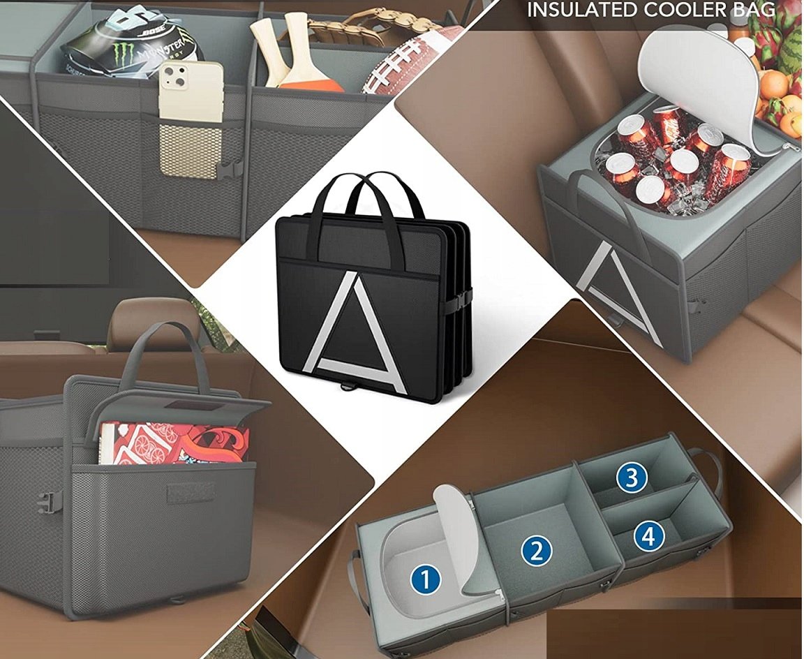 Bardzo mocny sztywny organizer samochodowy z wodoodpornej tkaniny z przegrodą na mrożonki i zimne napoje.