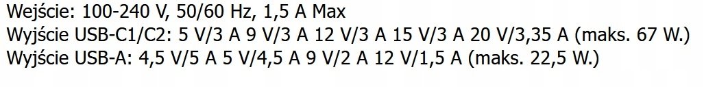 Moc maksymalna - 67W, Quick Charge 3.0 , 4.0