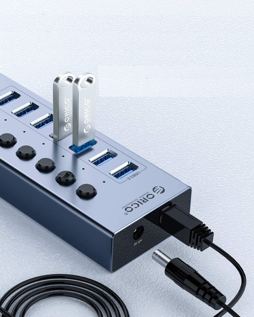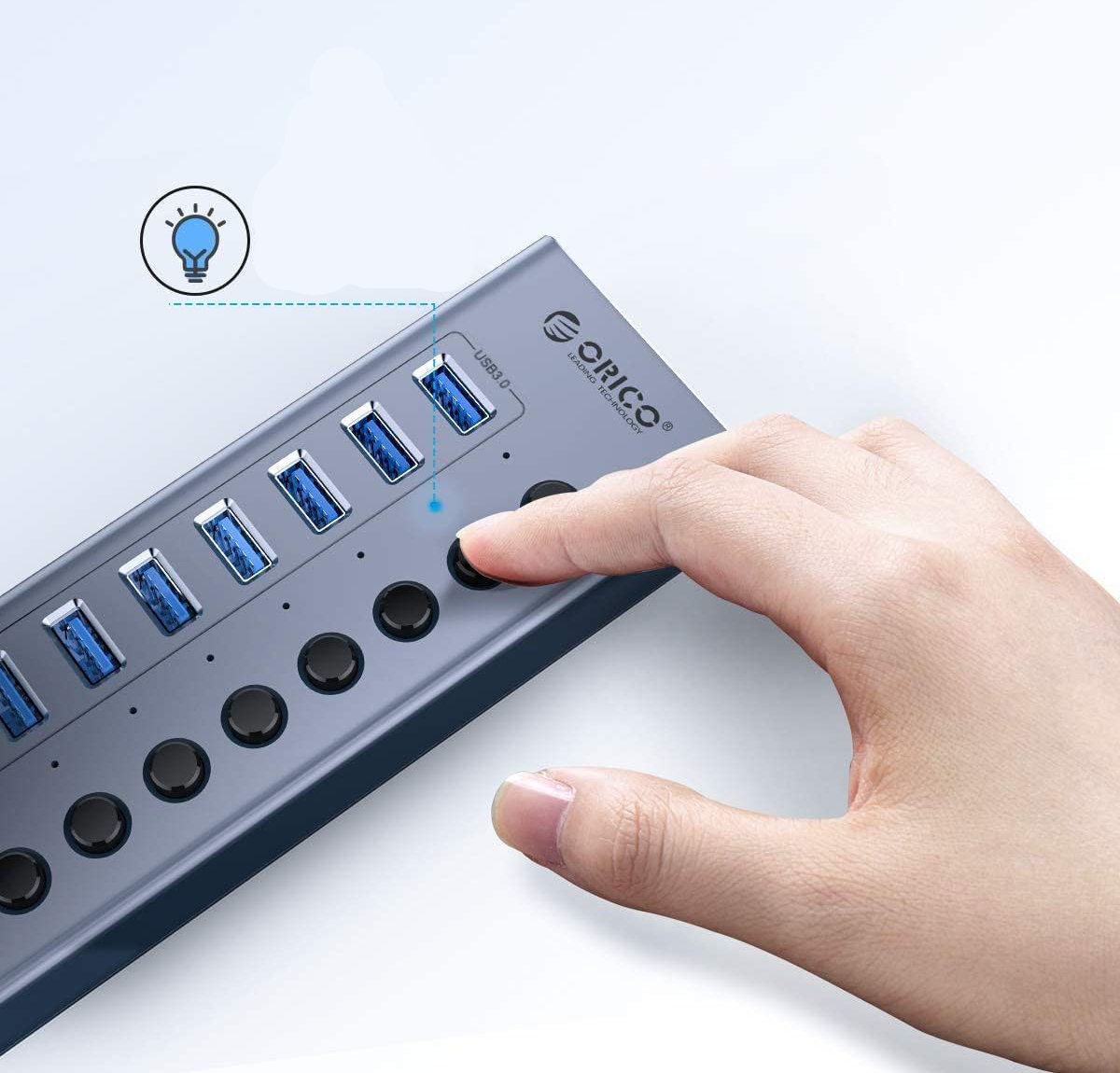 Hub USB Orico BT2U3-7AB – 7x USB-A 3.0, indywidualne włączniki, transfer do 5Gbps, kompaktowy design i aluminiowa obudowa – szary