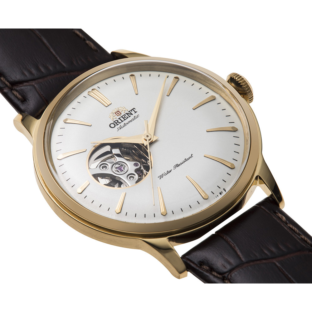 Ten nowy zegarek mechaniczny o średnicy 40,5 mm z serii Orient, oferujący efektowne połączenie klasyki i znakomitego kunsztu zegarmistrzowskiego, ma kilka wyjątkowych cech. Zaokrąglone szkiełko zegarka elegancko obramowuje obło sklepioną tarczę w kolorze srebra, osadzoną w pięknej kopercie ze stali szlachetnej w kolorze złota. Gustownego wzornictwa zegarka dopełnia stylowy przeźroczysty spód koperty. Dodatkowe warte uwagi cechy to między innymi tarcza z częściowo odkrytym mechanizmem, atrakcyjny pasek na wszystkie okazje, gustowne wskazówki w kolorze złota i koronka do ręcznego nakręcania z automatycznym naciągiem.
