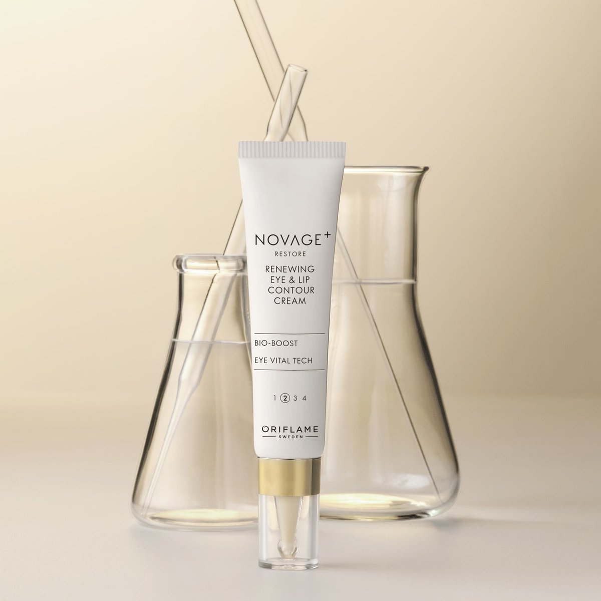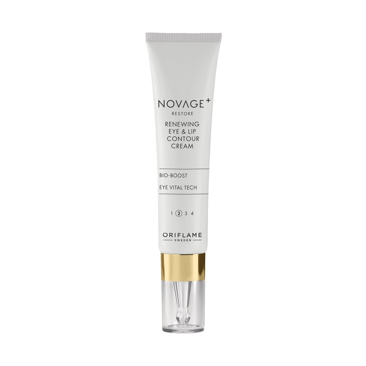 Odnawiający krem do okolic oczu i ust Novage+ Restore przywraca młodzieńczy wygląd rysom twarzy, działając przeciwstarzeniowo na kontur oczu i ust. Zapewnia także niezbędne nawilżenie, by natychmiast odświeżyć i rozświetlić zmęczone oczy.